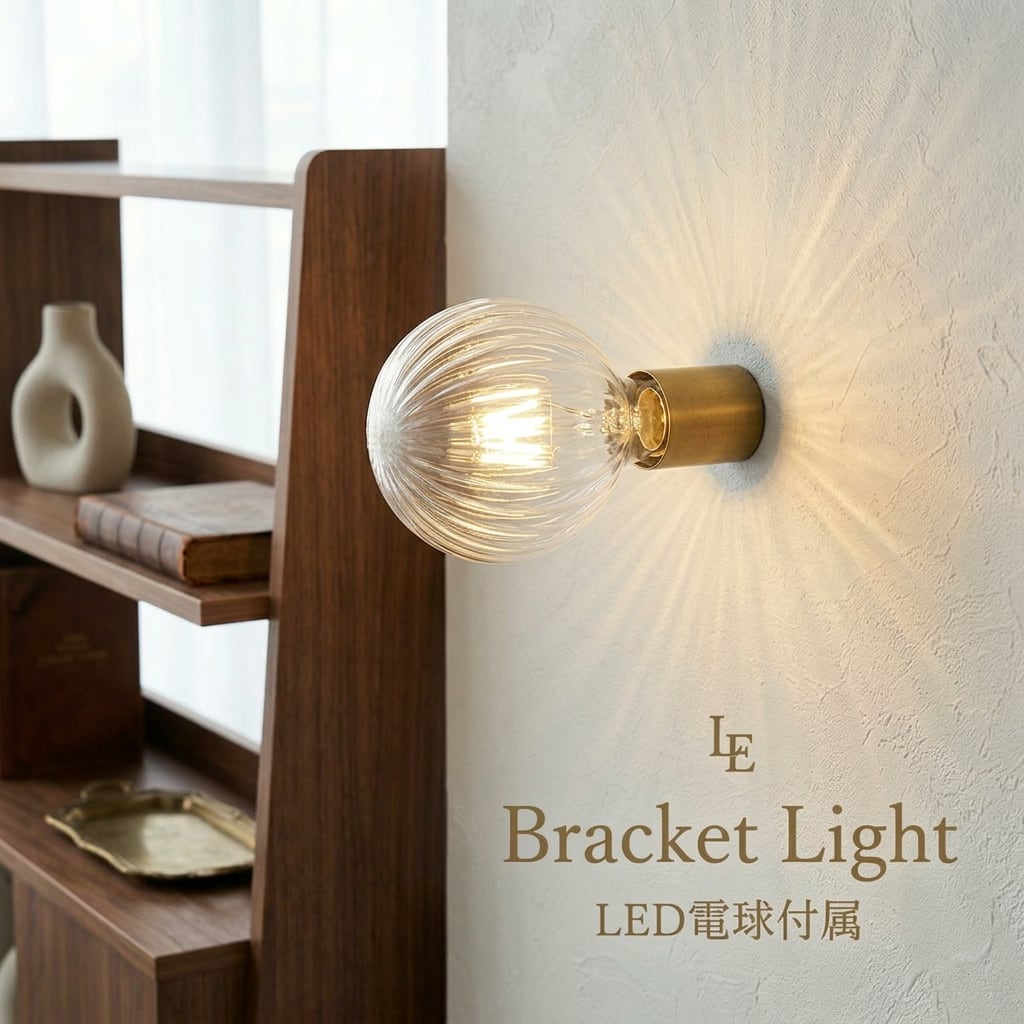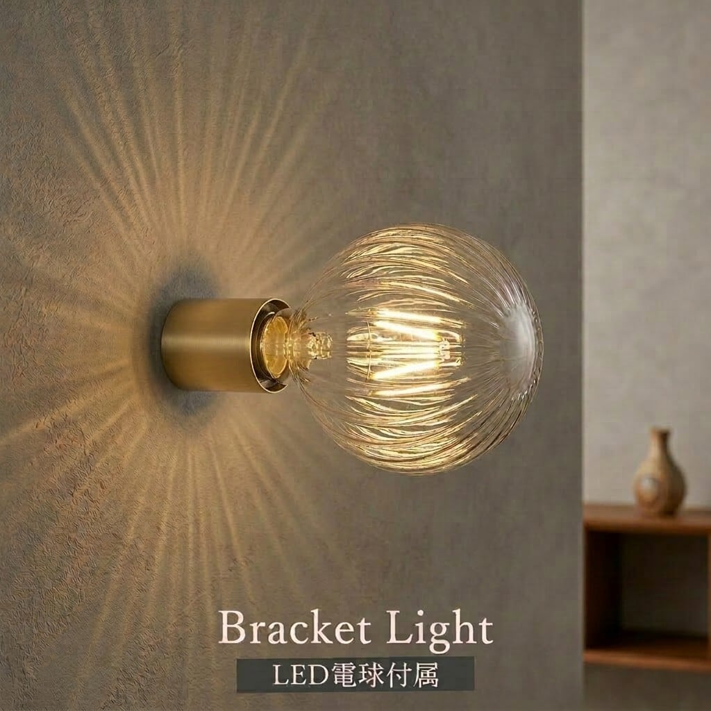 シンプルな真鍮製のソケットにまるでガラスシェードの様な 波模様が付いたLED電球がセットになったブラケットライト。 トイレや廊下、玄関、階段、パントリー、クローゼットや洗面など 小さい空間にお勧めな照明器具です。<br>
