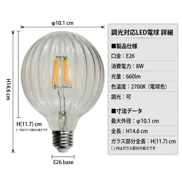 電球サイズ:φ10.1xH14.6(11.7)cm<br>